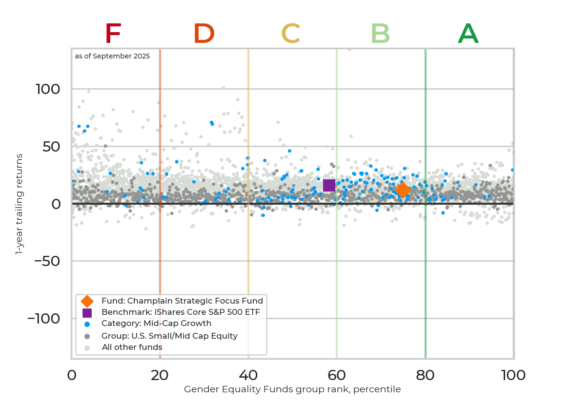 The figure above charts annualized returns and Gender Equality Fund grades. The orange marker represents this fund. The purple marker (if present) represents an assigned benchmark. Blue dots represent funds in the same Morningstar category as this fund. Dark gray dots represent funds in the same grading group as this fund. Returns are for the most recent available for this fund of 1, 3, 5, or 10 year annualized returns. The higher a fund is marked on the Y axis, the better its returns for the specified time period. The higher a fund is marked on the X axis, the better its Gender Equality Funds group ranking. Read more on the How it Works page.