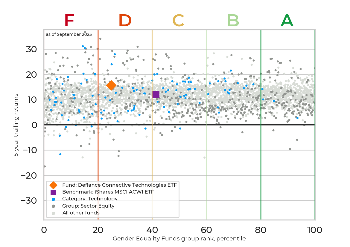 The figure above charts annualized returns and Gender Equality Fund grades. The orange marker represents this fund. The purple marker (if present) represents an assigned benchmark. Blue dots represent funds in the same Morningstar category as this fund. Dark gray dots represent funds in the same grading group as this fund. Returns are for the most recent available for this fund of 1, 3, 5, or 10 year annualized returns. The higher a fund is marked on the Y axis, the better its returns for the specified time period. The higher a fund is marked on the X axis, the better its Gender Equality Funds group ranking. Read more on the How it Works page.