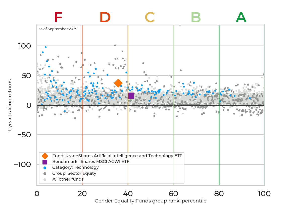 The figure above charts annualized returns and Gender Equality Fund grades. The orange marker represents this fund. The purple marker (if present) represents an assigned benchmark. Blue dots represent funds in the same Morningstar category as this fund. Dark gray dots represent funds in the same grading group as this fund. Returns are for the most recent available for this fund of 1, 3, 5, or 10 year annualized returns. The higher a fund is marked on the Y axis, the better its returns for the specified time period. The higher a fund is marked on the X axis, the better its Gender Equality Funds group ranking. Read more on the How it Works page.