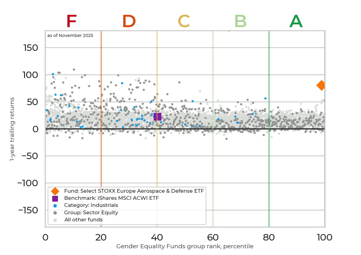 The figure above charts annualized returns and Gender Equality Fund grades. The orange marker represents this fund. The purple marker (if present) represents an assigned benchmark. Blue dots represent funds in the same Morningstar category as this fund. Dark gray dots represent funds in the same grading group as this fund. Returns are for the most recent available for this fund of 1, 3, 5, or 10 year annualized returns. The higher a fund is marked on the Y axis, the better its returns for the specified time period. The higher a fund is marked on the X axis, the better its Gender Equality Funds group ranking. Read more on the How it Works page.